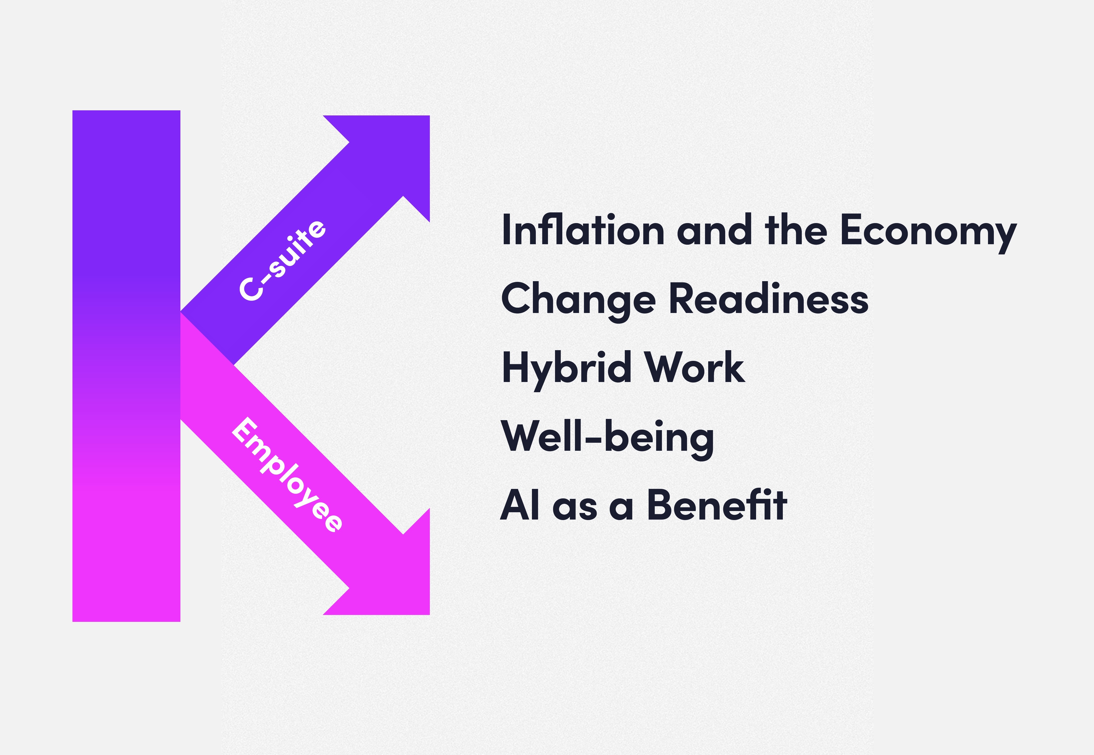 Within companies, a new kind of K-shape is emerging – a divergence in perspectives between leadership and the workforce. Executives often view transformation initiatives as necessary and opportunity-rich, particularly in AI adoption, hybrid work redesign and operational agility. Employees, however, may experience these shifts as destabilizing, raising concerns about workload, well-being, job security or the real benefits of recent technologies.